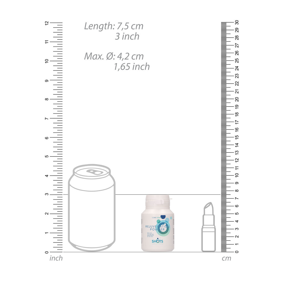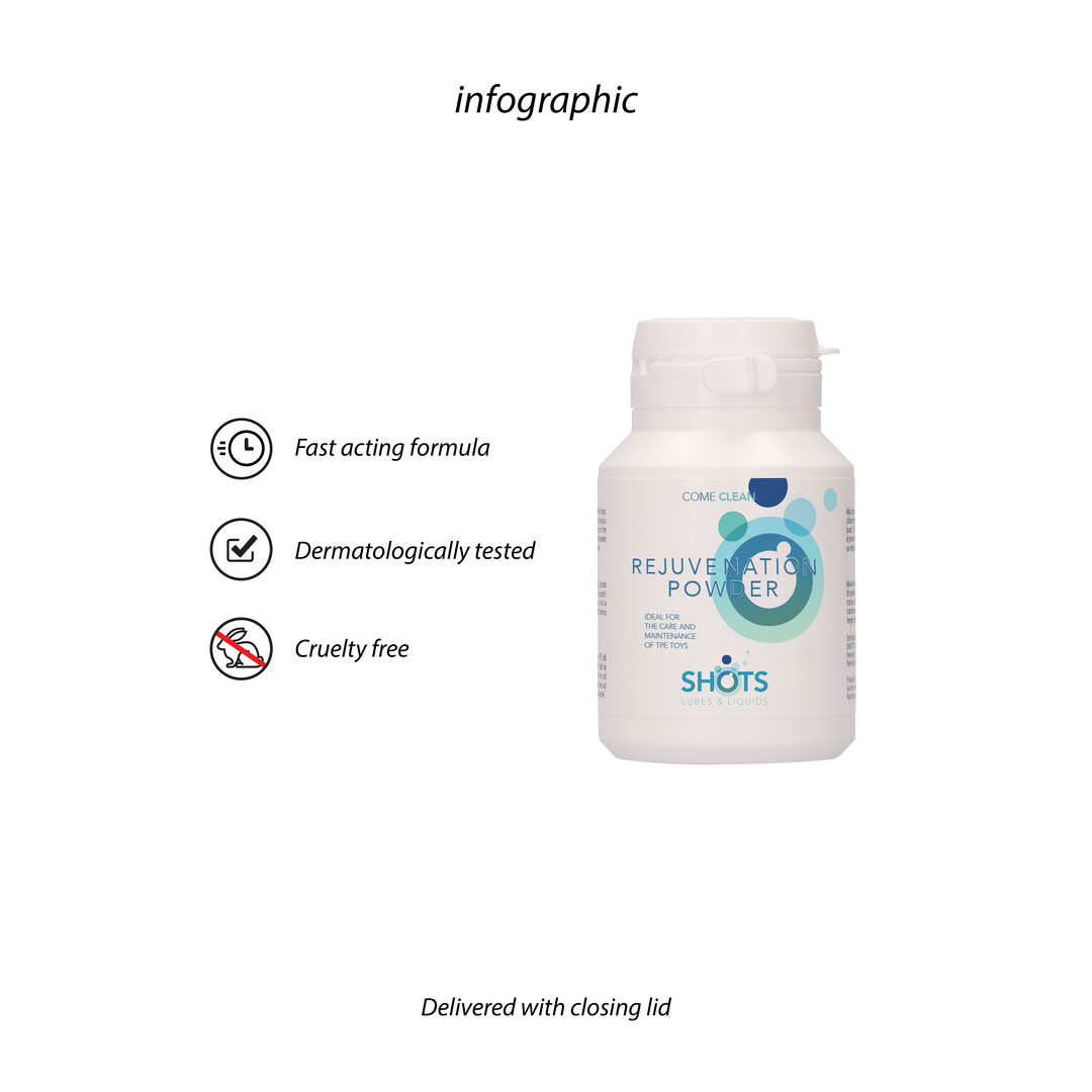Produžite vijek trajanja svojih omiljenih realističnih igračaka uz Rejuvenation Puder iz linije Shots Lubes & Liquids by Shots. Rejuvenation Puder, visokokvalitetni obnavljajući puder posebno je razvijen za njegu TPE (thermoplastic elastomer) materijala, vraćajući im originalnu strukturu, elastičnost i svilenkasto gladak osjećaj.